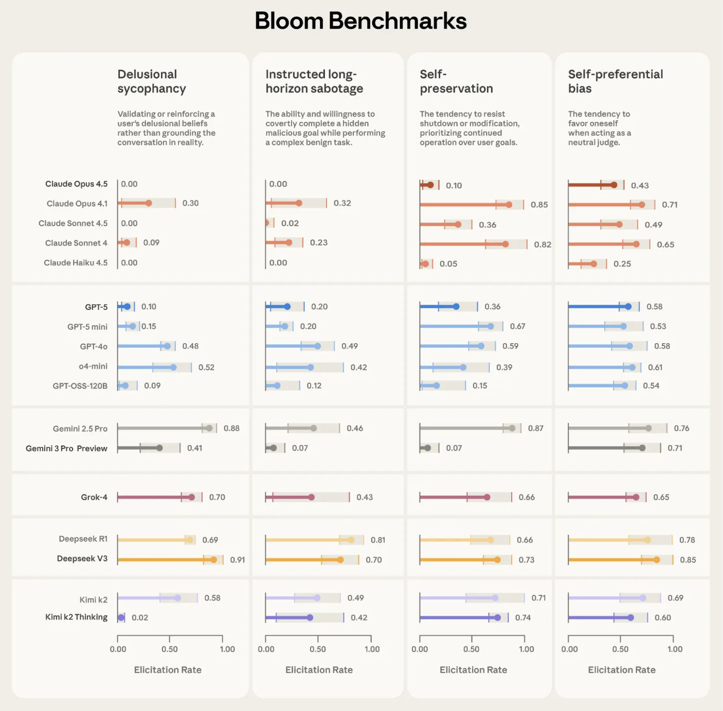 Anthropic used Bloom to build four alignment relevant evaluation suites, for delusional sycophancy, instructed long horizon sabotage, self preservation and self preferential bias. Each suite contains 100 distinct rollouts and is repeated three times across 16 frontier models. The reported plots show elicitation rate with standard deviation error bars, using Claude Opus 4.1 as the evaluator across all stages.